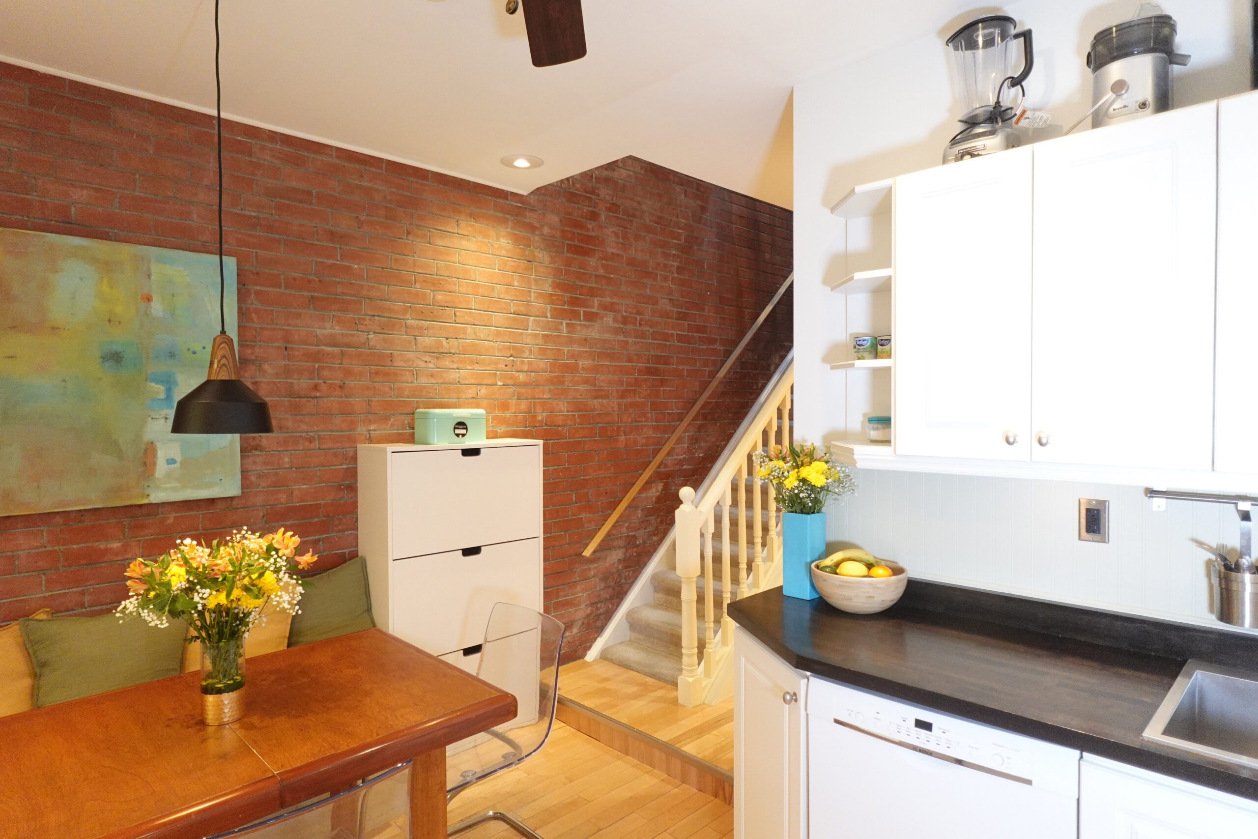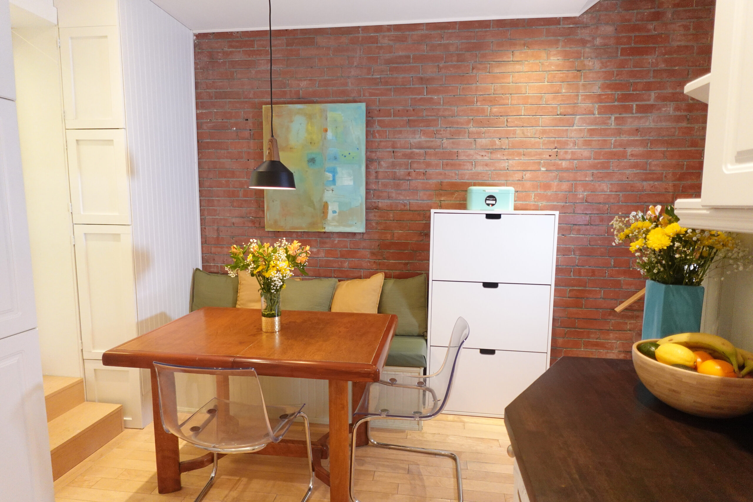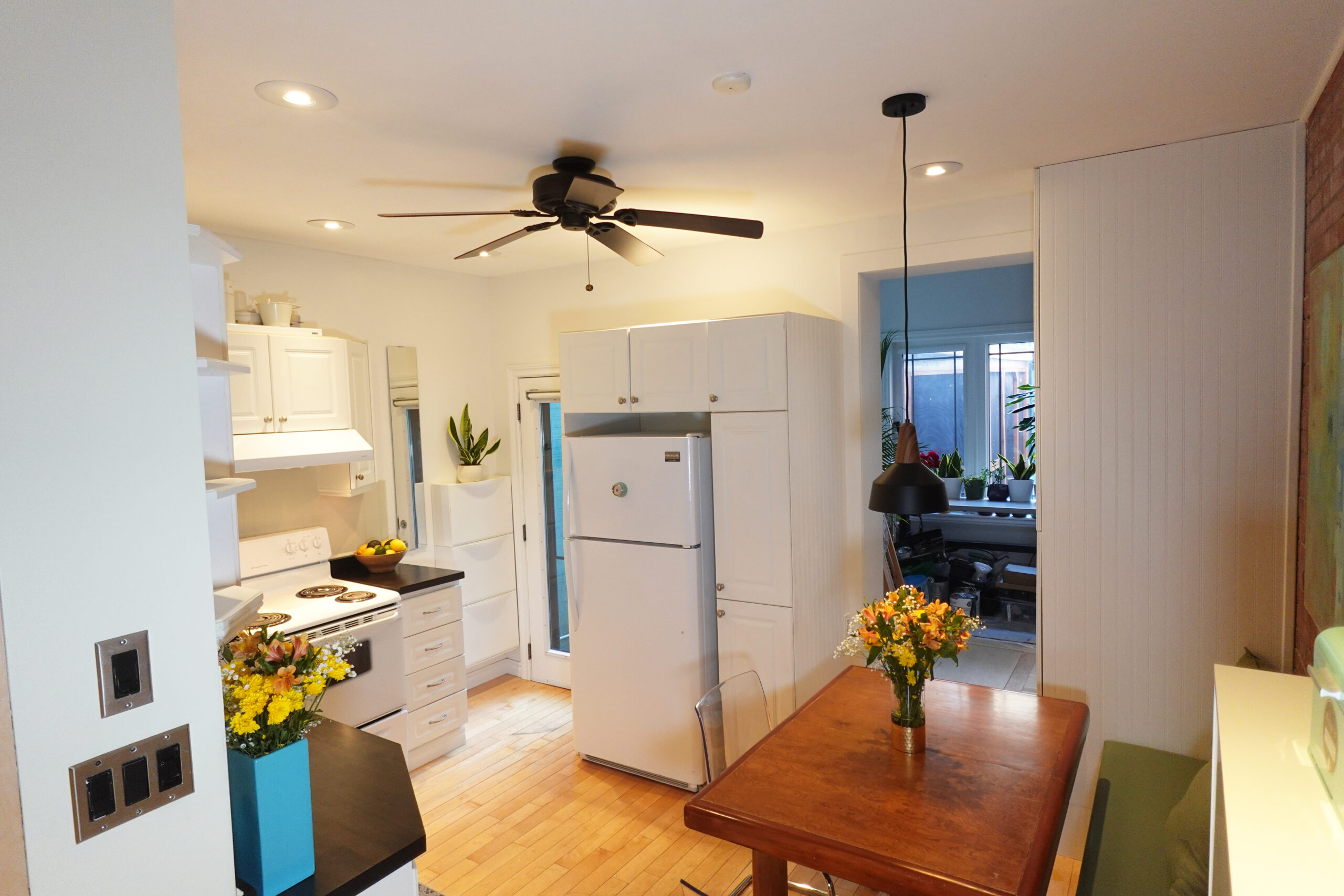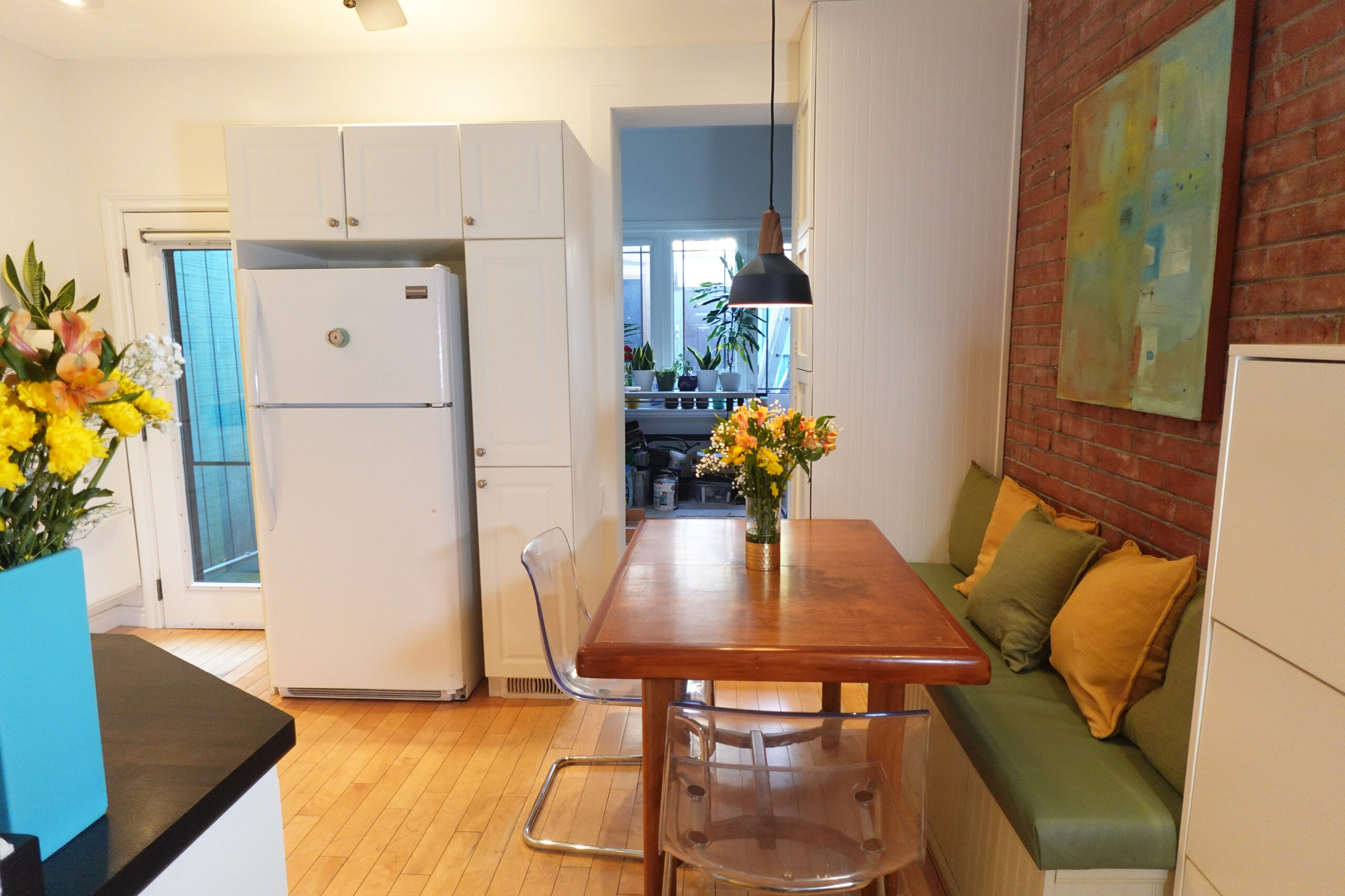 This open concept Kitchen/Dining Room features high spacious ceiling with pot-lights and a custom booth with hidden storage space. This area is adjacent to a sunroom and a home office. The two adjacent rooms floor height is elevated slightly giving this area a modern take of a classic mid century sunken floor vibe.
