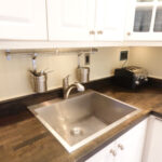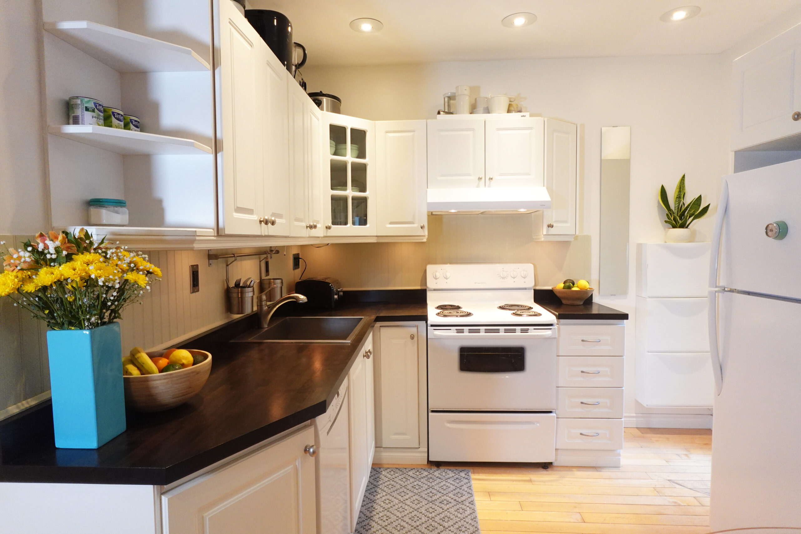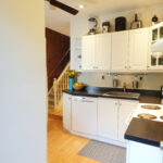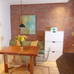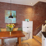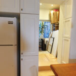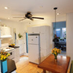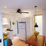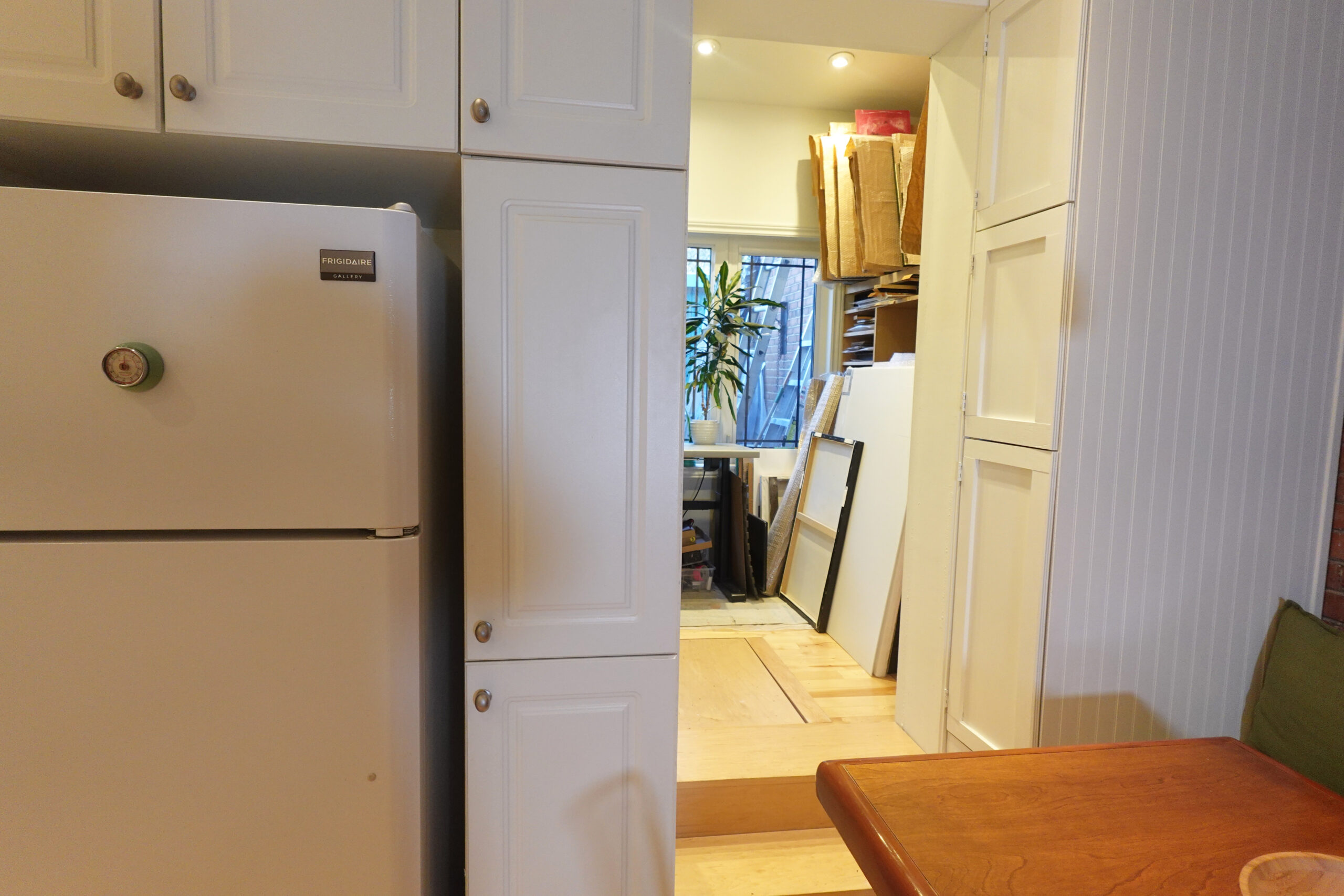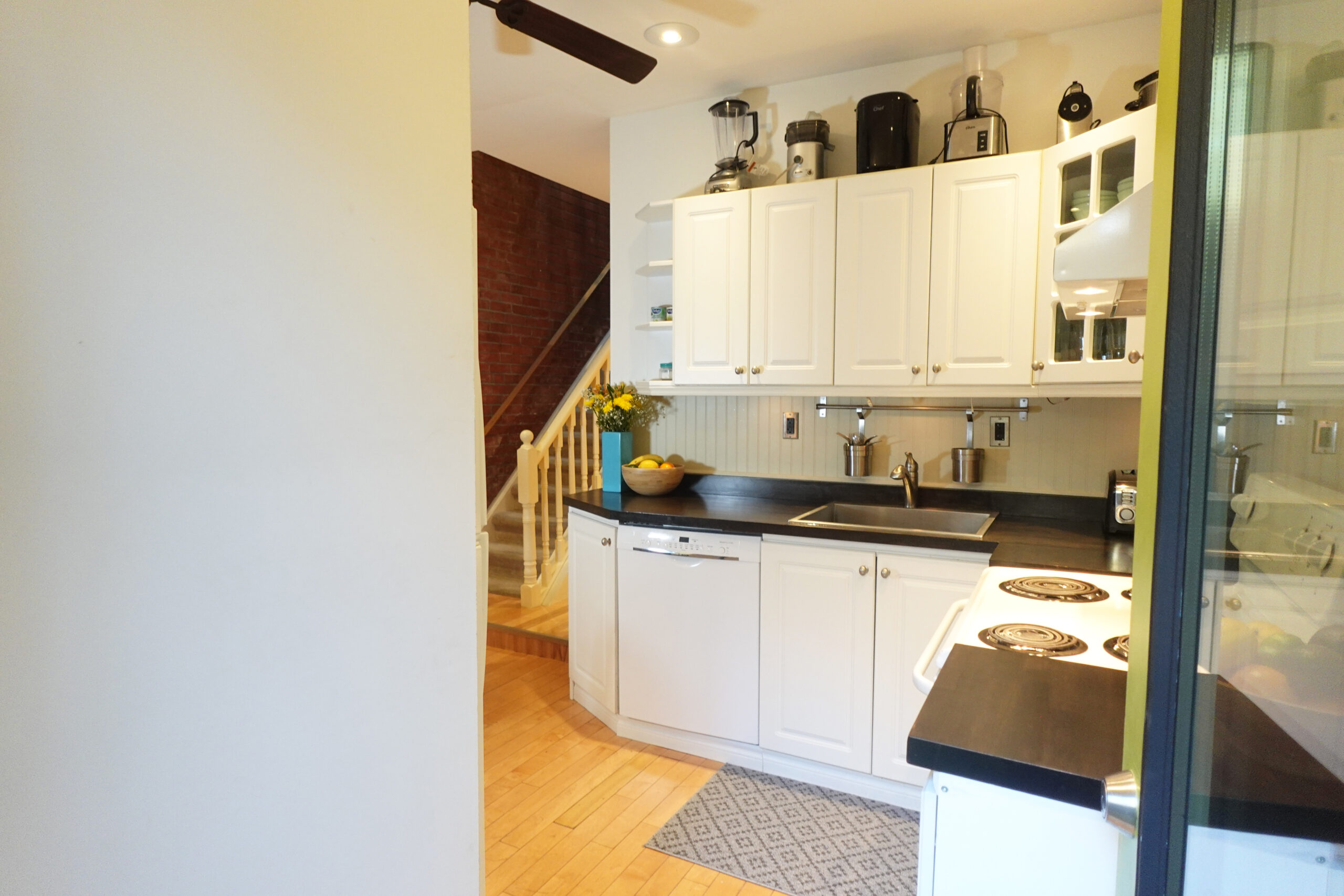 This open concept Kitchen/Dining Room features high spacious ceiling with pot-lights and a custom booth with hidden storage space. This area is adjacent to a sunroom and a home office. The two adjacent rooms floor height is elevated slightly giving this area a modern take of a classic mid century sunken floor vibe.