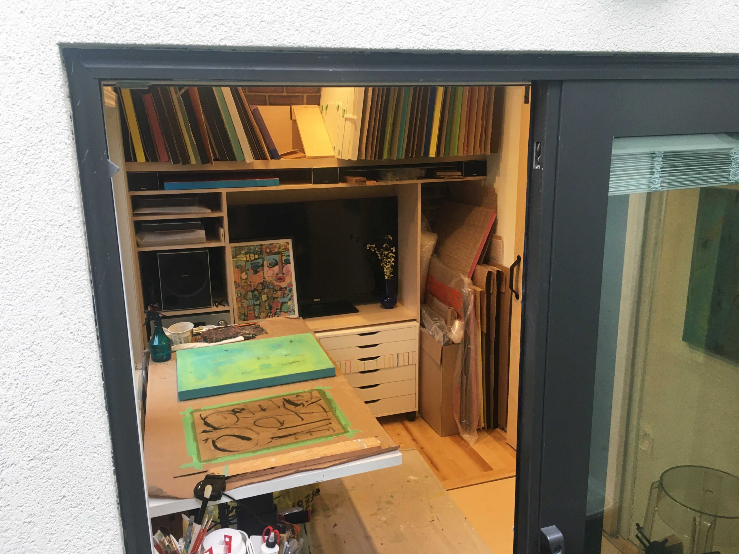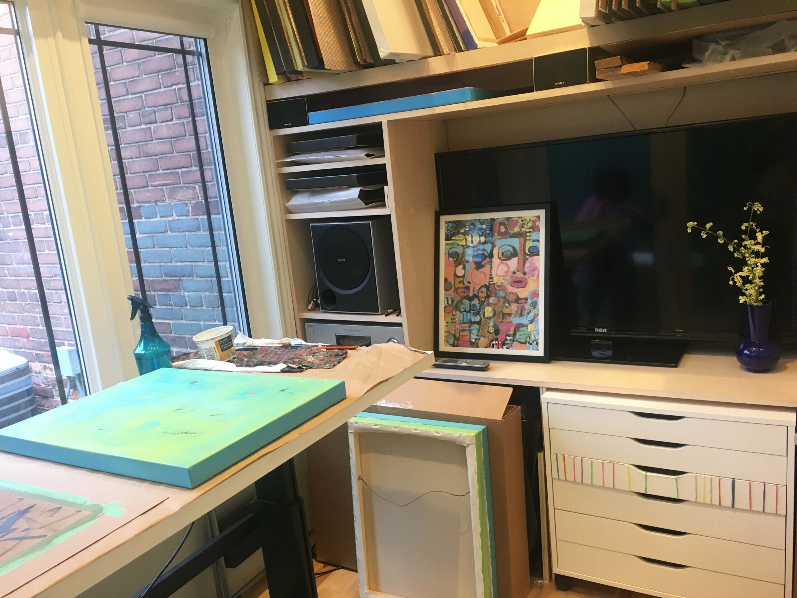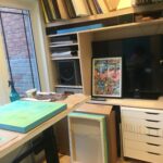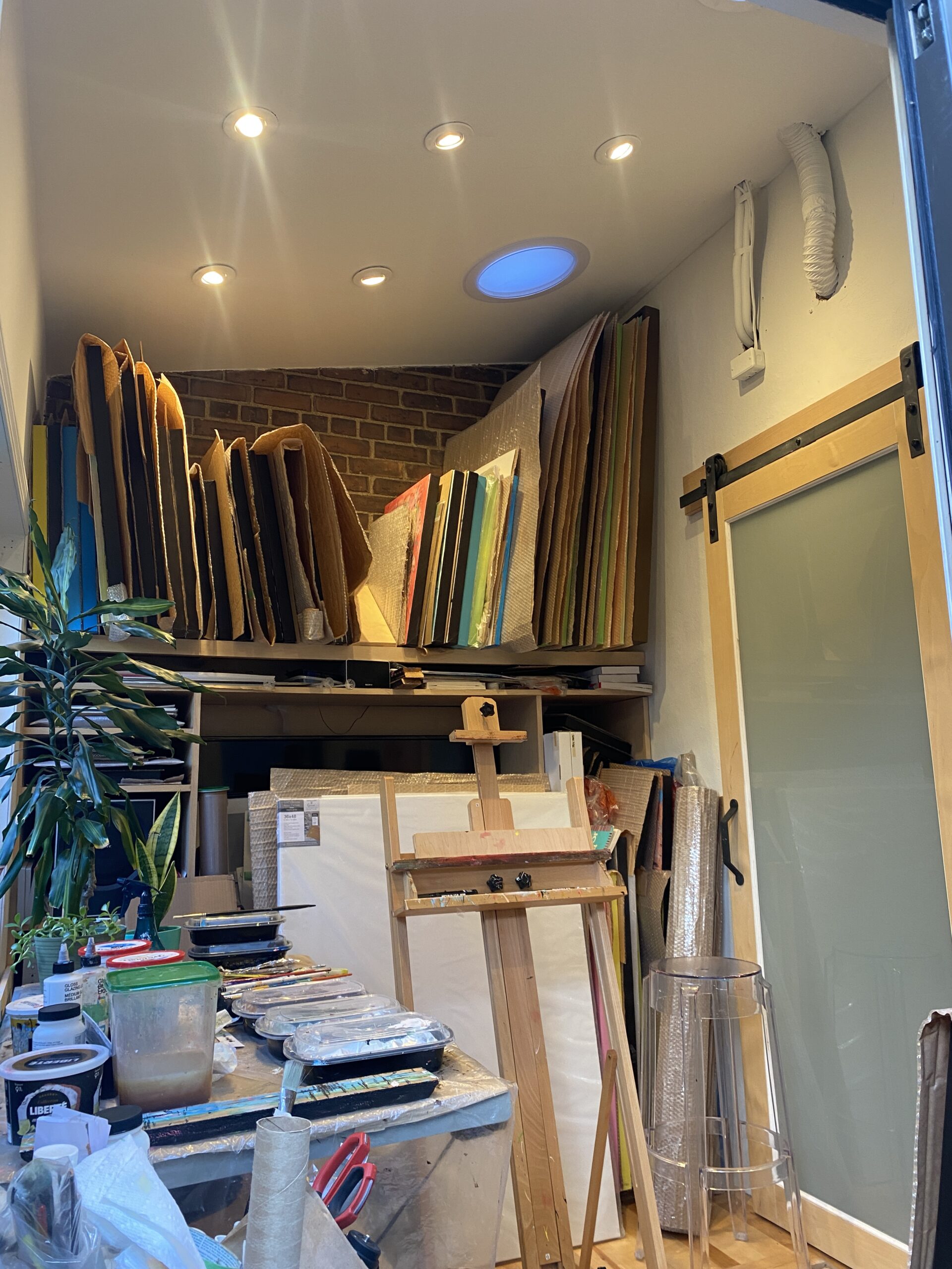This room features designer sun tunnels large windows. It is currently being used as an art studio. It has a built in desk system overlooking exposed brick.This can easily be turned into a home office, a guest bedroom, or even a small living room area as it is wired for Dolby 5.1 surround sound.